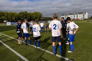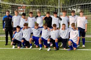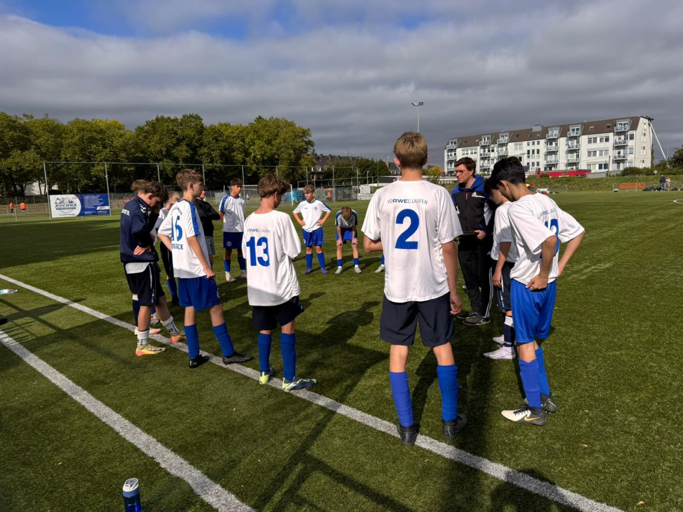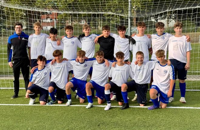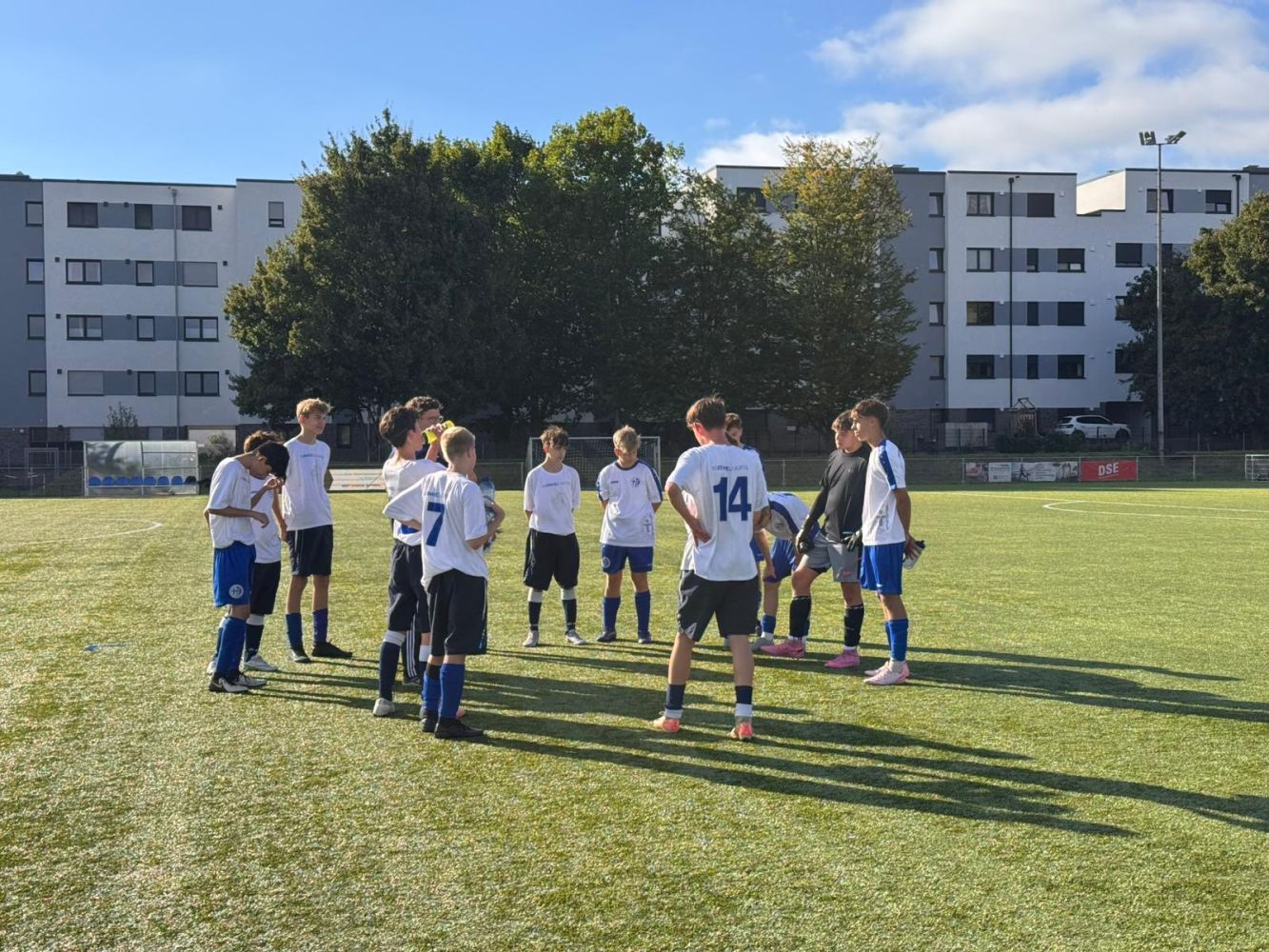 Im ersten Aufeinandertreffen gegen die spielstarken Schüler der Heinrich-Böll-Gesamtschule musste unsere Mannschaft, nach einem frühen Tor durch Mats, mit dem Pausenpfiff das 1:1 nach einem Eckball hinnehmen. Lange Zeit hatte dieses Ergebnis Bestand, unsere „Blau-Weißen“ arbeiteten diszipliniert gegen den Ball und die Abwehr um Paul und Jonah agierte kompromisslos. Kurz vor Schluss bot sich für Mats aus 18 Metern noch einmal eine Abschlussgelegenheit, die dieser mit einem satten Linksschuss zu nutzen wusste und zur umjubelten Führung traf. Damit nicht genug: Philipp nutzte eine weitere Gelegenheit und stellte auf 3:1, was den Endstand der Partie bedeutete.