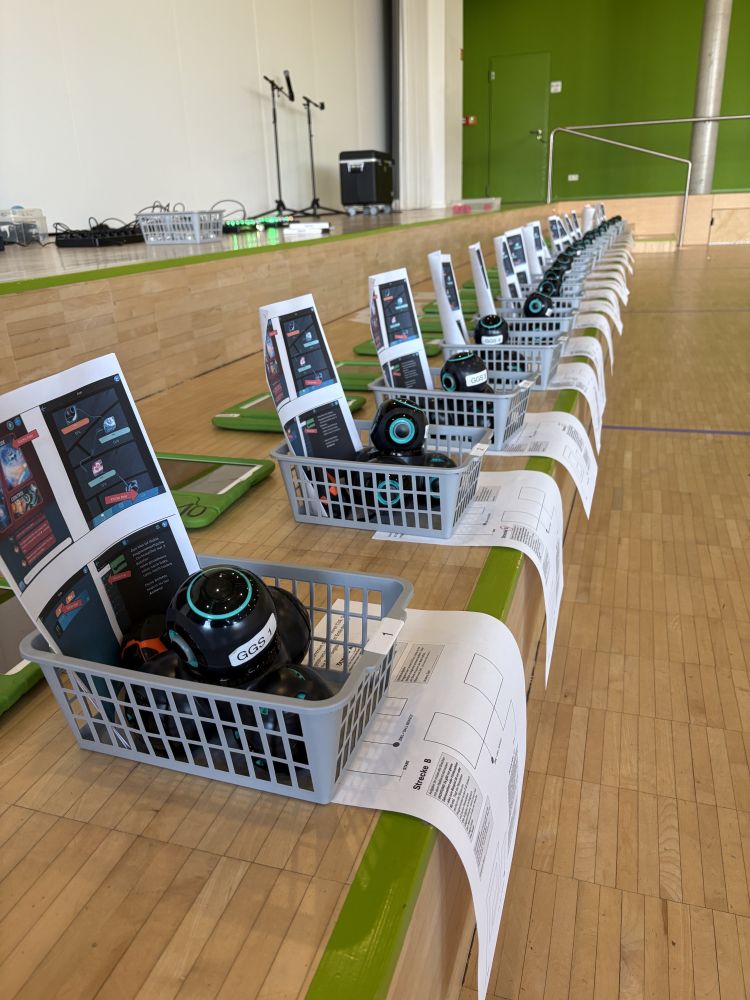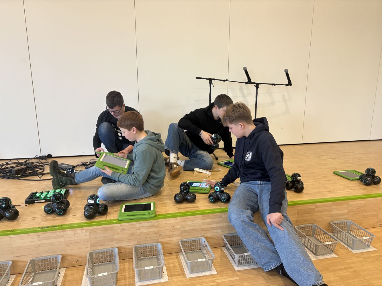 In der dritten und vierten Stunde ging es mit den größeren CUE-Robotern weiter. Über Tablets programmierten die Kinder die Roboter blockbasiert und testeten anschließend ihre Fähigkeiten in kleinen Herausforderungen.