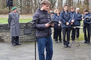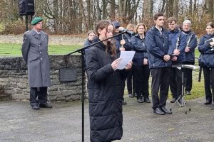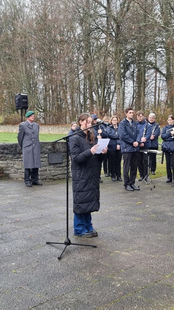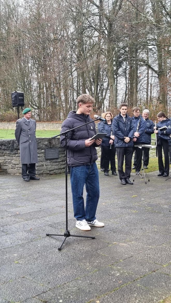 Am 16.11.2025 war Volkstrauertag, ein Tag zum Gedenken an die Opfer von Krieg und Gewaltherrschaft unserer Vergangenheit. Das Franziskus-Gymnasium liegt direkt neben einer ganz besonderen Gedenkstätte, der Kriegsgräberstätte Hürtgendwald Vossenack. Hier nun versammelten sich am vergangenen Sonntag Menschen aus der Gemeinde und der Region, um an die furchtbaren Geschehnisse und Folgen des Krieges zu erinnern. Dazu brachten Alonja und Ben, beide SchülerIn der Jahrgangsstufe EF unseres Gymnasiums, ihre Gedanken vor. Junge Menschen erinnern an die dem Krieg zum Opfer gefallenen jungen Menschen. Eine wahre Geste gegen das Vergessen, die ganz besonders in der heutigen Zeit wichtiger denn je ist. Es zeigt: Jugendliche beschäftigen sich mit der Historie unseres Landes, unserer Gesellschaft. Sie reflektieren und sind sich ihrer Verantwortung zur Mitgestaltung einer friedlichen Zukunft bewusst. Alonja und Ben machten mit ihren Worten aufmerksam. Vor allem aber machen sie auch Mut, den Weg in eine lebenswerte Zukunft anzutreten.