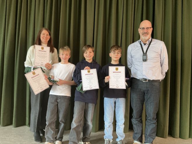 Mathelehrerin Frau Grodde und Schulleiter Dirk Sieven gratulierten Benjamin, Leo und Can herzlich zu diesem tollen Erfolg und ihrem engagierten Einsatz. Eine Leistung, die zeigt, wie viel Spaß Mathematik machen kann – besonders im Team! Gestern wurde den drei „Bros“ in der Aula die Urkunde zur erfolgreichen Teilnahme verliehen.
